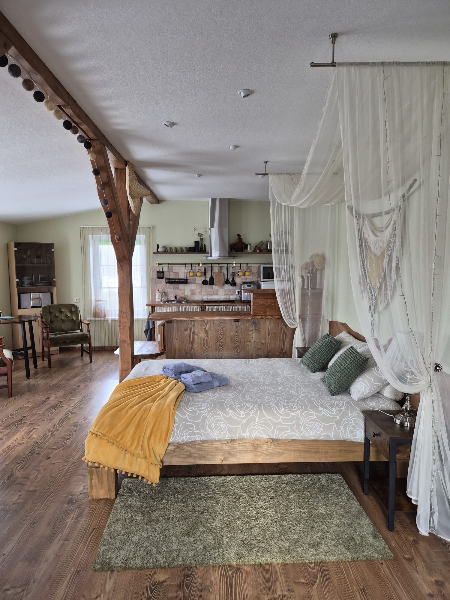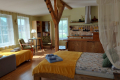 Apartments XXL for 2 people (bed 180 x 200, towels, hairdryer, iron, TV, internet, pellet fireplace, heated floors, fully equipped kitchen, quality drinking water, good coffee, grill, skewers, trampoline, campfire place, terrace with canopy and view of the well-kept garden, outdoor relaxation area). The apartments offer 3 additional beds and a travel cot for little guests. Located in the same building as the pool and sauna - just a few steps away!