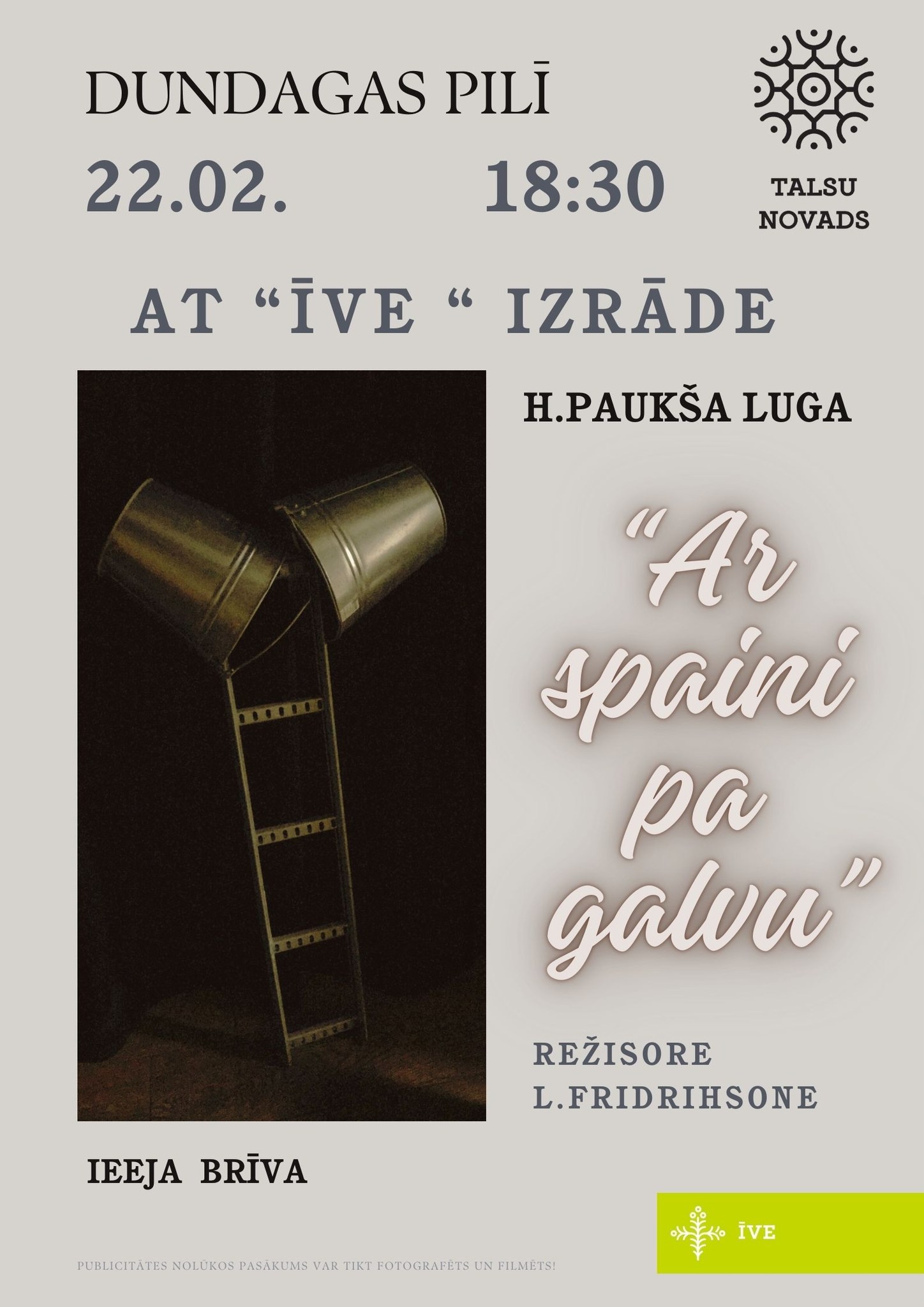 22. februārī plkst. 18.30 Dundagas pilī viesosies amatierteātris ''ĪVE'' ar Hermaņa Paukša lugas izrādi “Ar spaini pa galvu”.