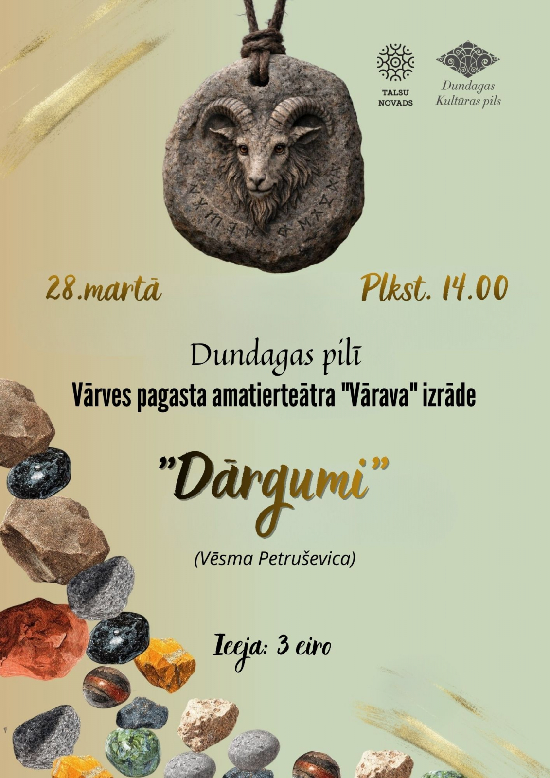 Dundagas Kultūras pils aicina uz Vārves pagasta amatierteātra “Vārava” izrādi “Dārgumi” – sirsnīgu teātra pēcpusdienu Dundagā.