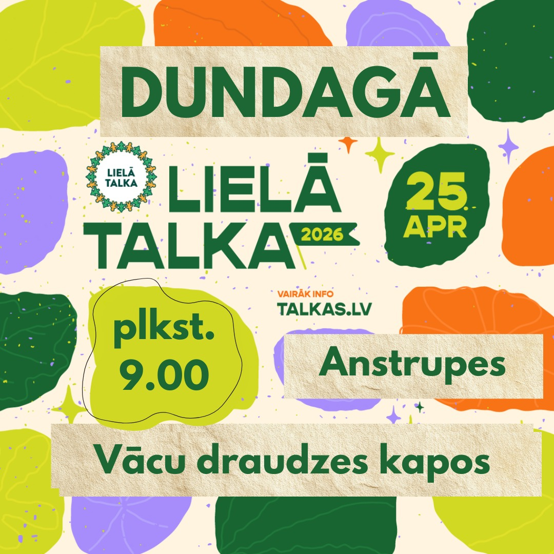 Sestdien, 25. aprīlī, plkst. 9.00 aicinām pievienoties Vislatvijas Lielajai talkai Dundagā, Anstrupē, kur kopīgi sakopsim Vācu draudzes kapus.
