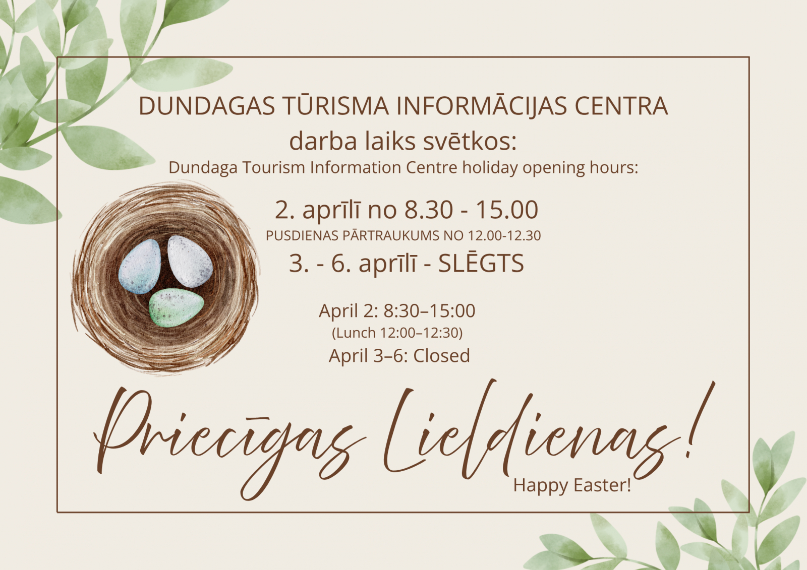 Informējam par Dundagas Tūrisma informācijas centra darba laiku svētkos: